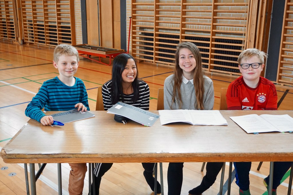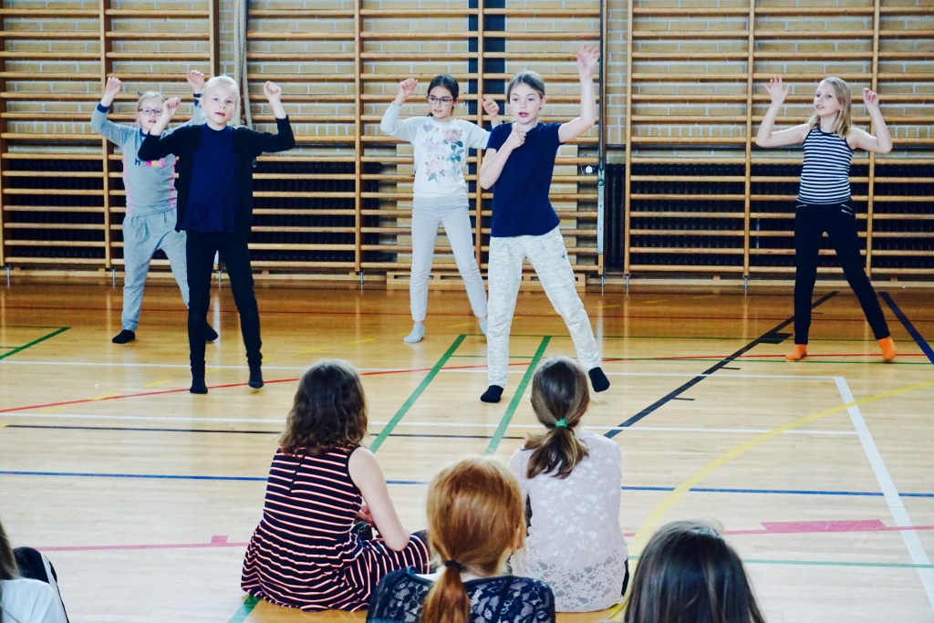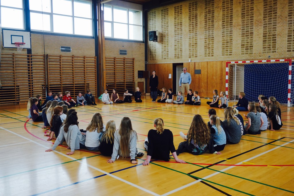 Jeg går ind ad dobbeltdøren med glasset, der giver efter, når man åbner den. Der er sko, skoletasker, løbehjul og jakker i hele indgangspartiet, men allerede her rammer lyden af glade og syngende børn mig. Jeg skal møde 4-6.klasses elever, der øver sig på musicalen, Maxfactor. Der er ikke langt igen. Den 17. maj er der premiere, så de fleste replikker, sange og "moves" begynder at sidde i skabet, næsten da.