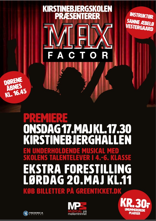 Maxfaktor en musical med udgangspunkt i reality-shows som X-factor og derfor tager fire dommere også plads i stolene bag den færdigbyggede scene. Imens fantasien tænder spotlyset, drømmer Michael Tøffner sig hen til premieren: "Når Maxfactor rammer premieredagen er det i andre rammer. Vi har professionelt lys- og lydudstyr, samt en stor scene på Kirstinebjergsskolens afdeling, Havepladsvej", fortæller han. (Treldevejens Skole)